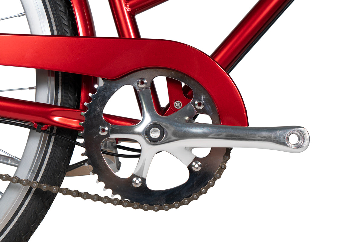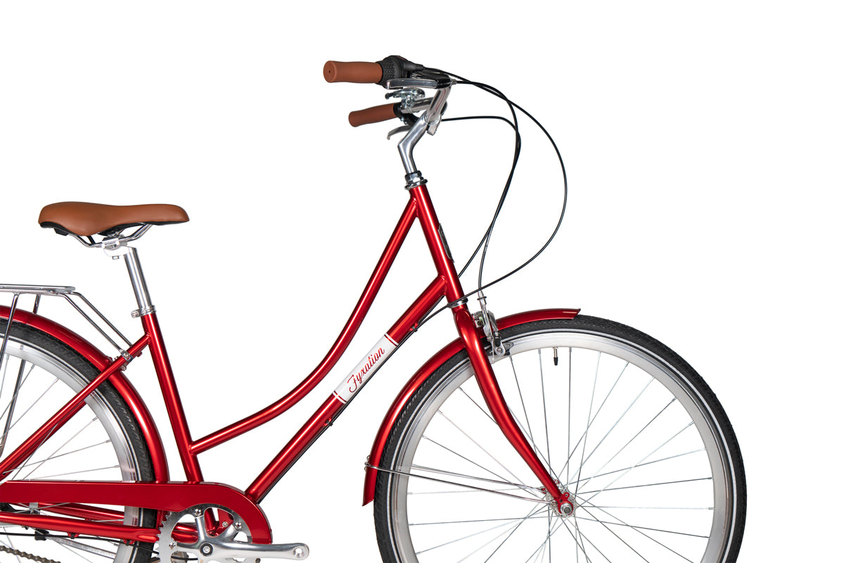 Built around a simple and reliable Shimano 3 speed hub with an easy to use twist shifter, this bike features elegant 1 color paint and simple styling. Finished off by matching painted fenders, painted chain guard and a built in rack, this bike is perfect for any city.